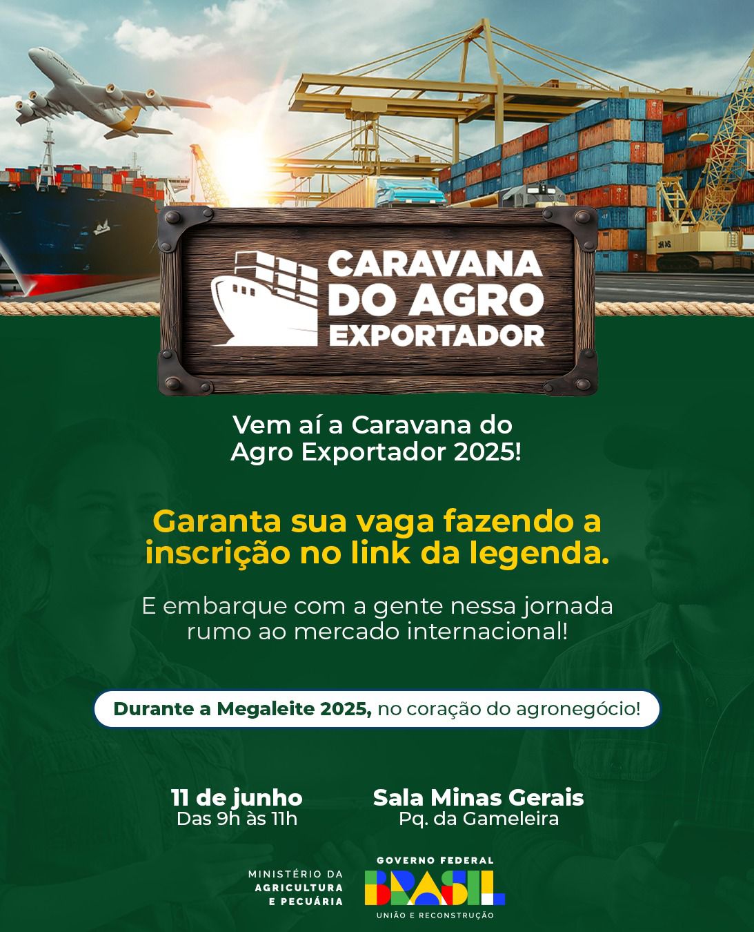 O Ministério da Agricultura e Pecuária (MAPA) realizará durante a 20ª Megaleite, que acontece de 10 a 14 de junho, no Parque da Gameleira, em Belo Horizonte/MG, uma edição do projeto Caravana do AgroExportador. O evento acontece no dia 11 de junho, às 9h, na Sala Minas Gerais, interior do parque, e tem como objetivo apresentar as oportunidades de exportação de material genético bovino, com foco especial em bovinos de leite.
